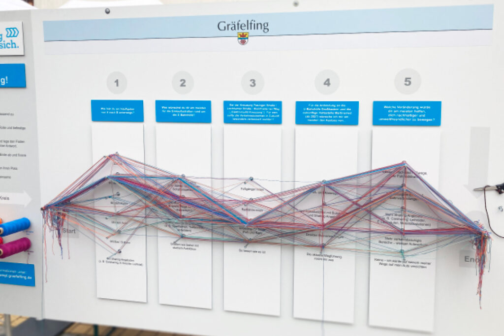 Für unseren Kunden Malte Hasselkus, Projektleiter Mobilität der Gemeinde Gräfelfing, haben wir im Rahmen des Straßenfests zwei interaktive Beteiligungsmodule eingesetzt. Ein Mobilitätsquiz, das spielerisch über Mobilitätsthemen informiert. Und unsere neu entworfene Fadengrafik, mit der wir ein direktes Stimmungsbild zur Mobilität in Gräfelfing erfassen konnten. Die Ergebnisse fließen nun in die weitere Argumentation und Kommunikation zukünftiger Maßnahmen ein.