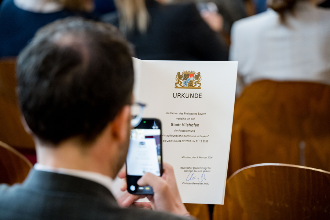 Ein echtes Highlight im AGFK-Jahr: Am 4. Februar 2026 wurden in der Münchner Scholastika erneut Kommunen ausgezeichnet, die sich mit Engagement, Ideen und Visionen für den Radverkehr einsetzen. Bayerns Verkehrsminister Christian Bernreiter und der AGFK-Vorsitzende Landrat Robert Niedergesäß zwölf Kommunen das Prädikat „Fahrradfreundliche Kommune in Bayern“. Damit tragen inzwischen diesen Titel.