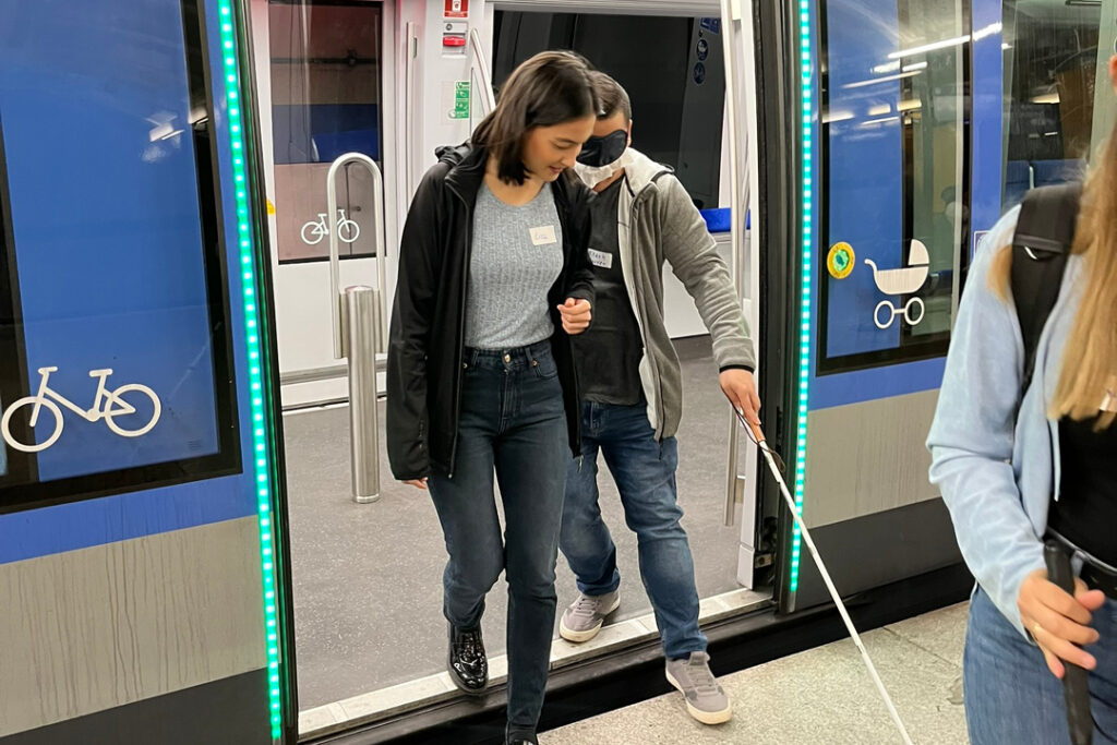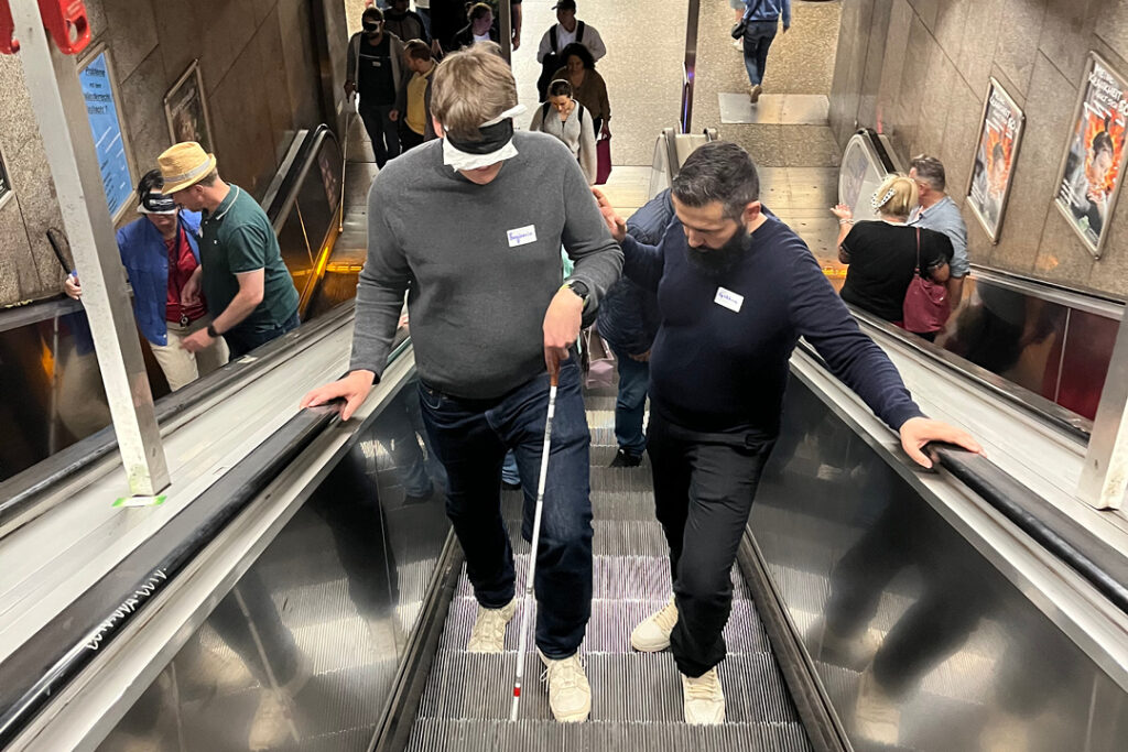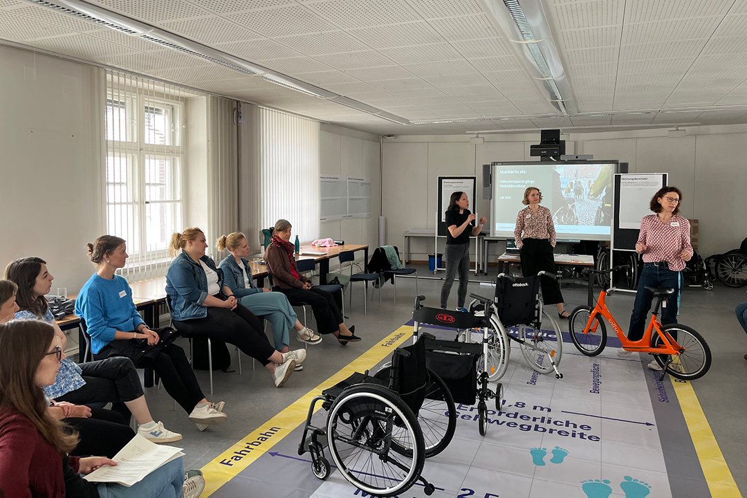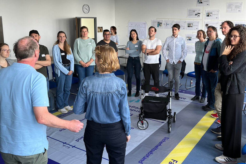 Die Teilnehmenden nähern sich einer Behinderung an und erleben durch Selbsterfahrung, wie sich ihre Mobilität im öffentlichen Raum verändert. Mit Blindenstöcken, Rollstühlen, Kopfhörern und weiteren Hilfsmitteln werden die Teilnehmenden in Situationen versetzt, in denen bekannte Wege plötzlich ungewohnt, unzugänglich oder herausfordernd wirken. Diese Perspektivwechsel hinterlassen Eindruck – und führen zu nachhaltigem Umdenken. In den anschließenden Reflexionen zeigen unsere Expert:innen konkrete Wege auf, wie barrierefreies Planen und Entscheiden im Alltag gelingt.