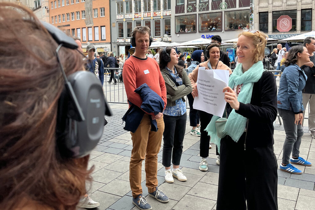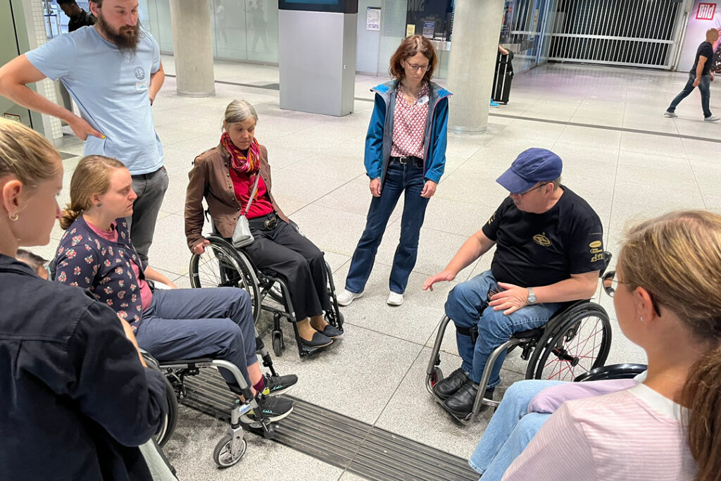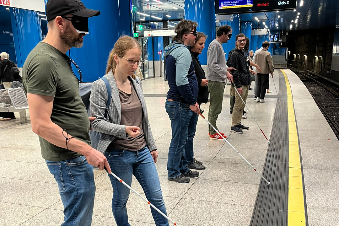 Bei unseren diesjährigen Inklusionsspaziergängen, beauftragt vom Mobilitätsreferat, waren rund 120 Mitarbeitende des Referats mit uns und unseren Expert:innen unterwegs und konnten die Perspektive Blinder, Gehörloser und Rollstuhlfahrender selbst erleben. In kleinen Gruppen haben wir den öffentlichen Raum neu wahrgenommen und waren mit den Expert:innen im Dialog.